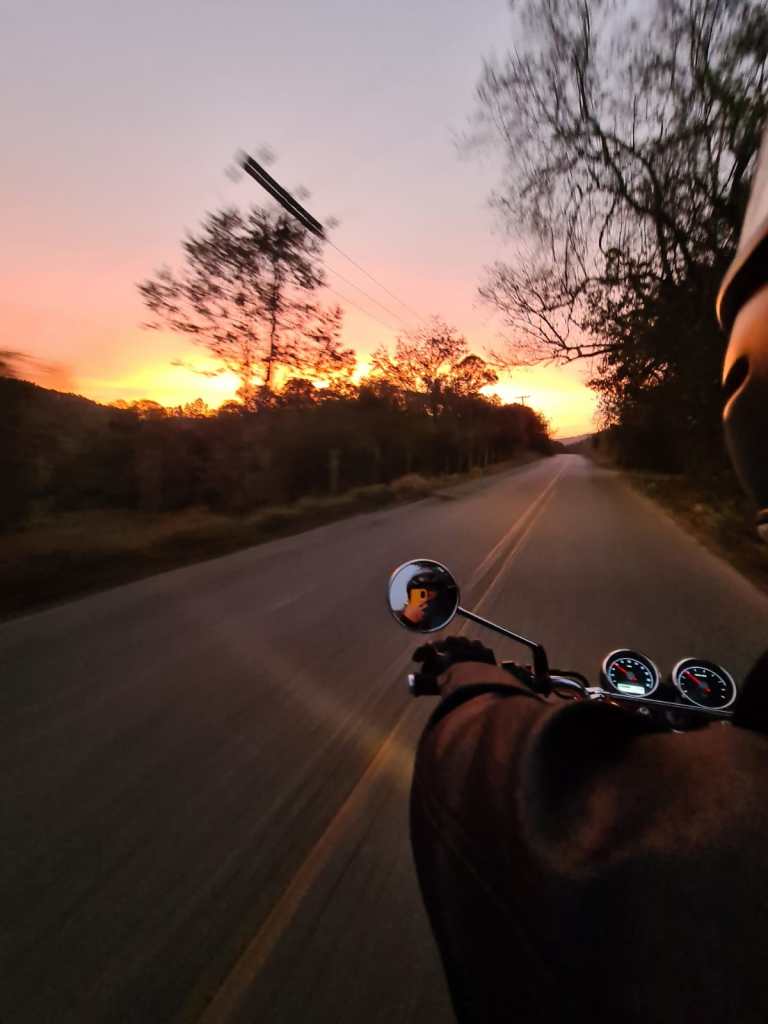 Apenas com a força de vontade e um pouco de consciência de que eu tinha que sair daquele vale (a grama estava branca e o vento contra), me superei e cheguei na primeira parte da subida, naquela suave curva pra esquerda que tem no início do aclive. Parei ali mesmo. Tinha um modesto raio de sol naquela área. Desliguei a moto, tirei a luva e fui roubar o calor do motor. Tive cuidado para não deixar muito tempo em contato e queimar a mão, já que estava dormente. Ao sentir que estava voltando à minha dignidade, peguei meu cantil que estava cheio de rum e o bebi. Foram 350 ml de bebida goela abaixo. A orelha esquentou e me surpreendeu que não teve embriaguez. Vi que poderia continuar. Continuemos a subir!