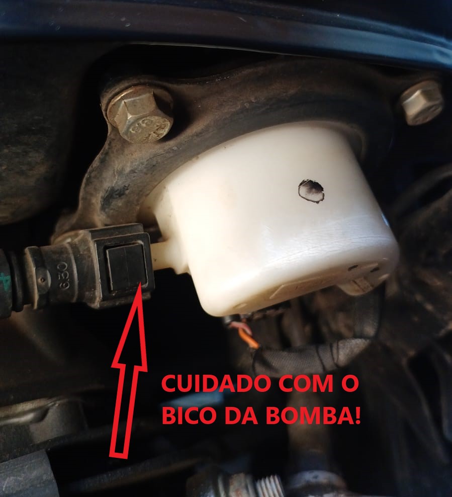 1 – É um bico de plástico, onde a mangueira da gasolina encaixa. O manuseio para retirada/inserção da mangueira deve ser feito com cuidado, apertando o conector dos dois lados e assim evitar forçar o bico lateralmente.